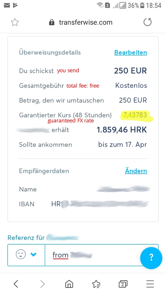 If you do so, your first transfer will be free of charges. In the example below, I sent 250 EUR to Croatia (HRK). Have a look at the guaranteed FX rate: