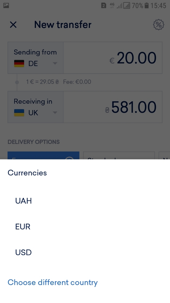 For some countries, there's even more than just one currency available. Transfers to Ukraine, for example, can be executed either in USD, UAH or EUR: