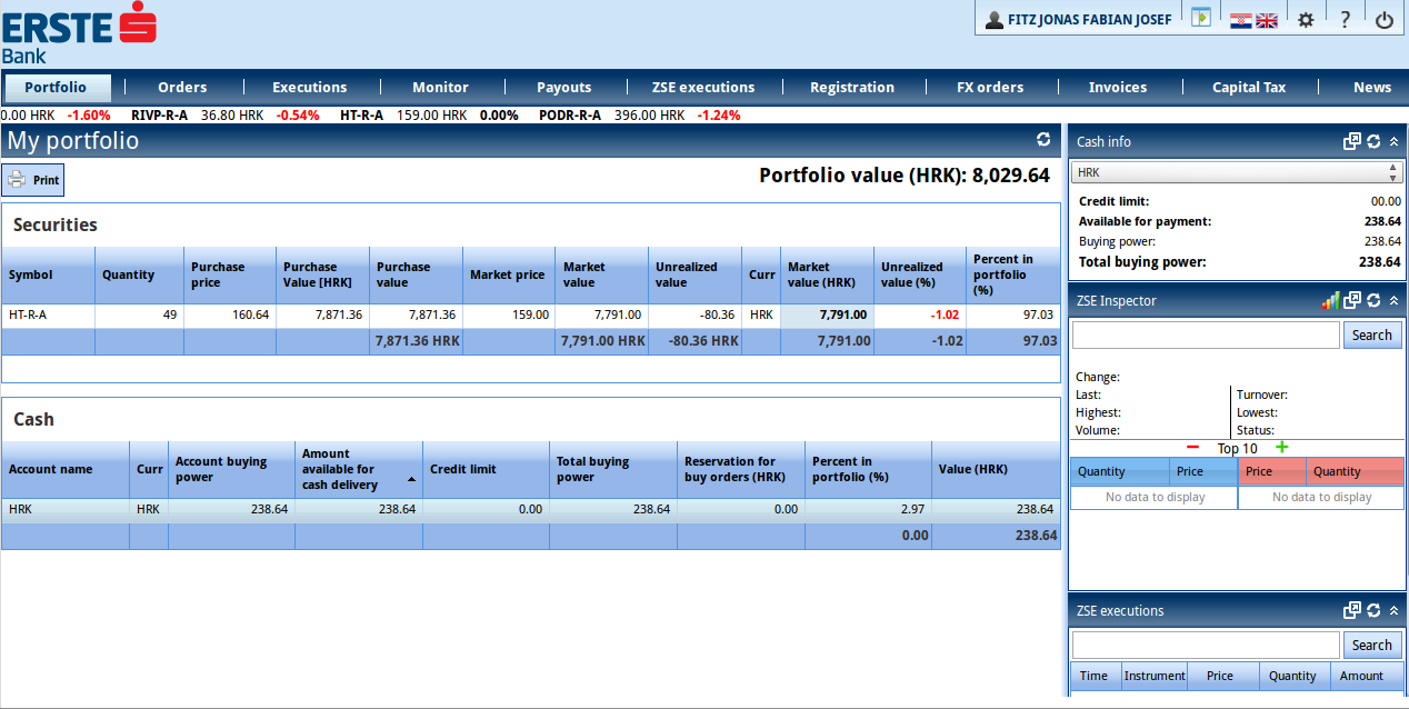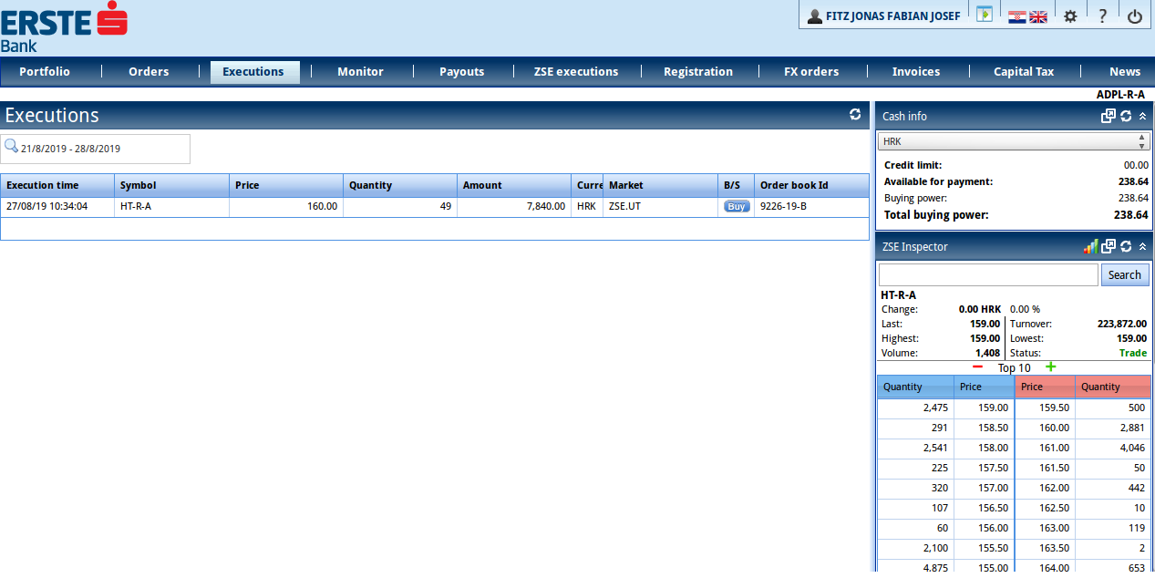 Um den Broker zu testen, habe ich Aktien der Telekom Hrvatski an der Zagreber Börse gekauft (ISIN HRHT00RA0005).