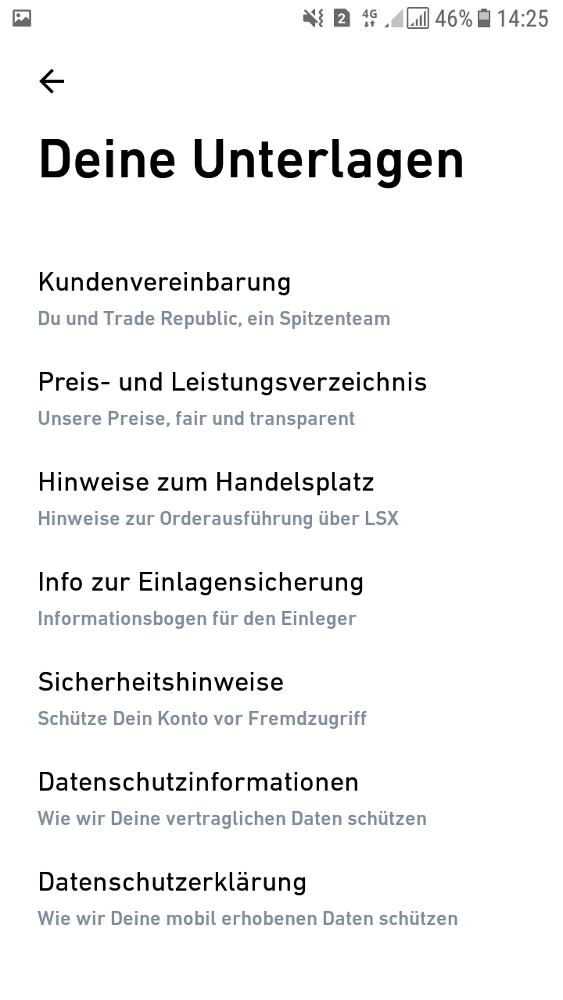 Anbei die grundlegenden Dokumente, die in der Trade Republic App unter Einstellungen -> Rechtliches ->Deine Unterlagen zu finden sind (Stand: 04.05.2019; siehe Abbildungen)
