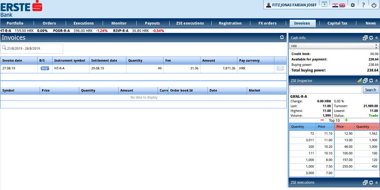 Um den Broker zu testen, habe ich Aktien der Telekom Hrvatski an der Zagreber Börse gekauft (ISIN HRHT00RA0005).